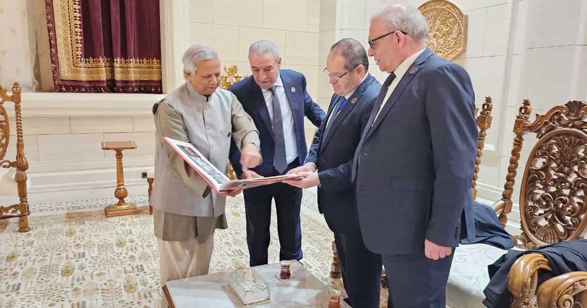 অধ্যাপক ইউনূস জুলাইয়ের গণ-অভ্যুত্থানের গ্রাফিতি ও ম্যুরালসমূহের ওপর একটি আর্ট বইয়ের অনুলিপি পিএলও মহাসচিবকে উপহার দেন।