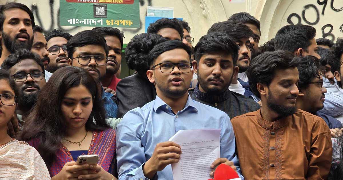 সংবাদ সম্মেলনে লিখিত বক্তব্য পাঠ করেন বৈষম্যবিরোধী ছাত্র আন্দোলনের সাবেক সমন্বয়ক আব্দুল কাদের এবং আবু বাকের মজুমদার।