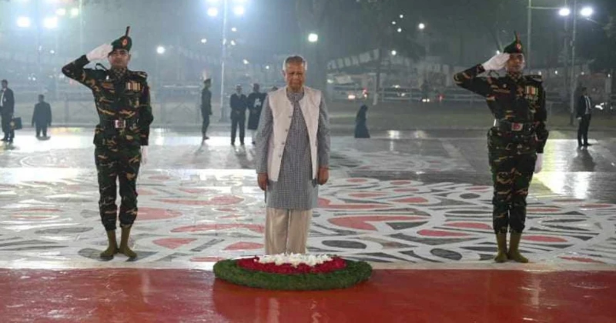 অমর একুশের ঐতিহাসিক গান ‘আমার ভাইয়ের রক্তে রাঙানো একুশে ফেব্রুয়ারি...আমি কি ভুলিতে পারি’ গানের সঙ্গে সঙ্গে প্রধান উপদেষ্টা শহিদ মিনারে পুষ্পস্তবক অর্পণ করেন। এসময় ভাষা শহিদদের স্মৃতির প্রতি গভীর শ্রদ্ধা জানিয়ে কিছুক্ষণ নীরবে দাঁড়িয়ে থাকেন তিনি।