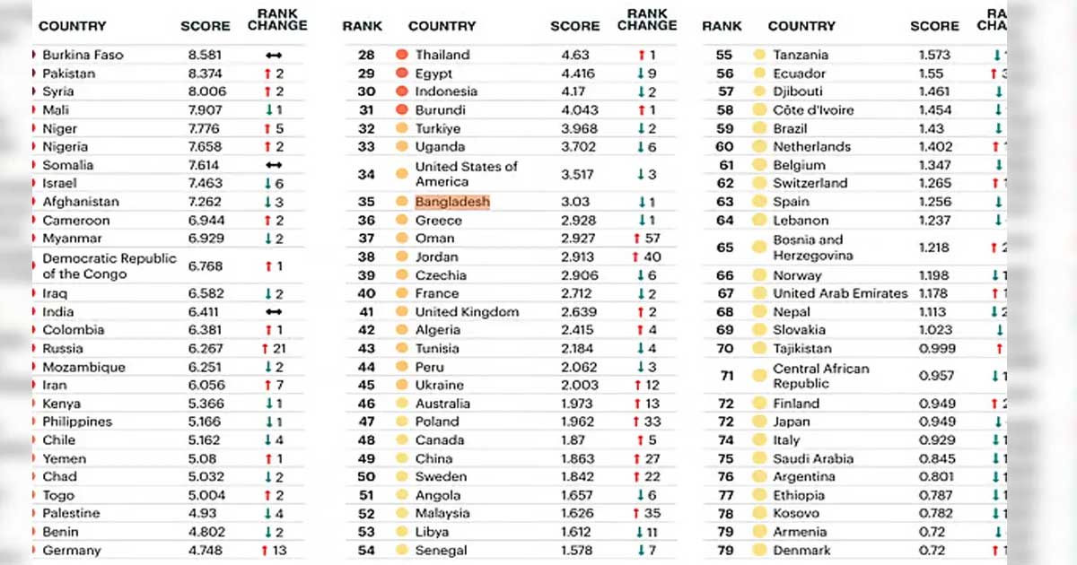 সূচকে দেখা গেছে, ৮.৫ পয়েন্ট নিয়ে গতবারের মতোই শীর্ষে আছে পশ্চিম আফ্রিকার দেশ বুরকিনা ফাসো। দ্বিতীয় অবস্থানে রয়েছে পাকিস্তান যার পয়েন্ট ৮.৩ এবং ৮ পয়েন্ট নিয়ে তৃতীয় অবস্থানে যুদ্ধবিধ্বস্ত সিরিয়া। এছাড়া ৭.২ পয়েন্ট নিয়ে নবম স্থানে আফগানিস্তান ছাড়া সূচকের প্রথম দশে দক্ষিণ এশিয়ার আর কোনো দেশ নেই।