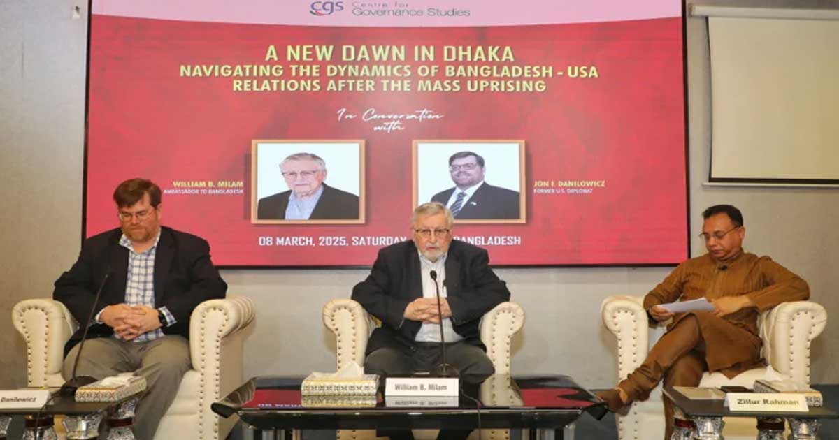 শনিবার ‘মাইলাম ও জনের সঙ্গে সংলাপ’ শীর্ষক আলোচনা সভায় ‘গণআন্দোলনের পর বাংলাদেশ-মার্কিন সম্পর্কের বর্তমান গতিশীলতা’ বিষয়ে আলোচনায় অংশ নেন সাবেক মার্কিন রাষ্ট্রদূত উইলিয়াম বি. মাইলাম ও সাবেক মার্কিন কূটনীতিক জন এফ. ড্যানিলোভিচ।