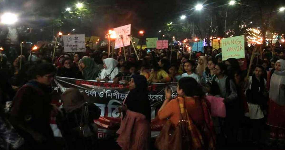 রোববার রাত ৮টায় ঢাকা বিশ্ববিদ্যালয়ের বিভিন্ন হলের কয়েকশ শিক্ষার্থী ধর্ষণবিরোধী মঞ্চের ব্যানারে রাজু ভাস্কর্যের সামনে থেকে মশাল মিছিল নিয়ে ক্যাম্পাস প্রদক্ষিণ করেন। পরে সেখানে সংক্ষিপ্ত সমাবেশ শেষে মশাল মিছিল নিয়ে ভিসি চত্বর হয়ে বিভিন্ন হলের সামনে দিয়ে শাহবাগ হয়ে মিছিল নিয়ে রাত ৯টার দিকে আবারও রাজু ভাস্কর্যের সামনে যান।
