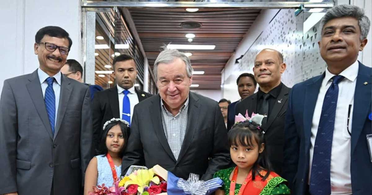 বৃহস্পতিবার বিকেলে জাতিসংঘের মহাসচিব ঢাকায় পৌঁছালে হযরত শাহজালাল আন্তর্জাতিক বিমানবন্দরে তাকে স্বাগত জানান পররাষ্ট্র উপদেষ্টা মো. তৌহিদ হোসেন।