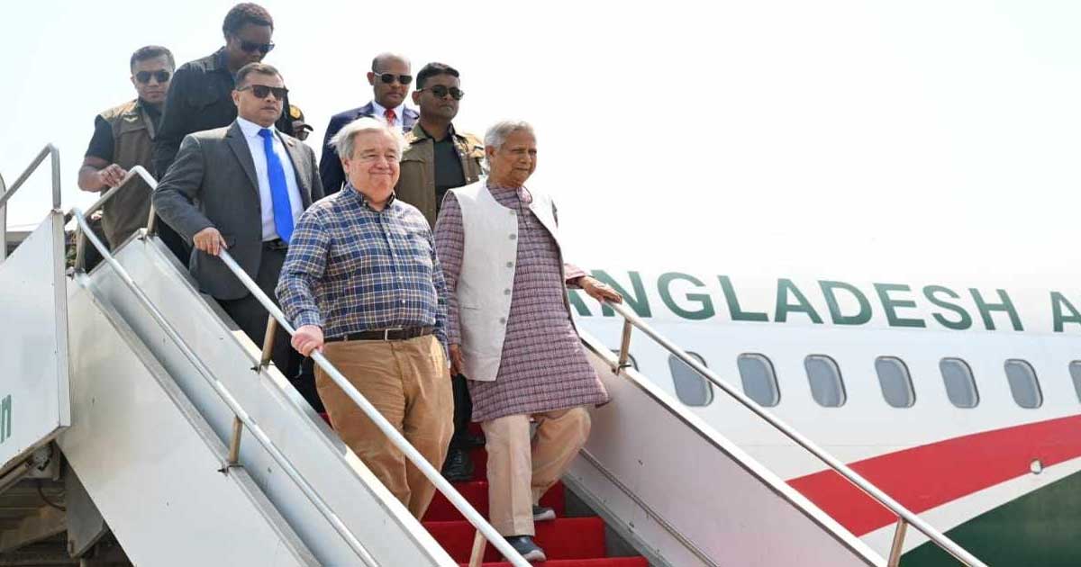 কক্সবাজার জেলা পুলিশের অতিরিক্ত পুলিশ সুপার জসিম উদ্দিন চৌধুরী বলেন, ‘শুক্রবার দুপুর ১টায় কক্সবাজার বিমানবন্দরে এসে পৌঁছেছে প্রধান উপদেষ্টা এবং জাতিসংঘের মহাসচিবকে বহনকারী বিমান।’