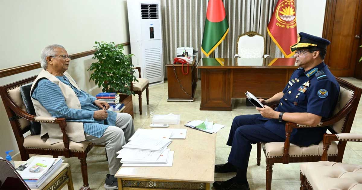 প্রধান উপদেষ্টা ড. মুহাম্মদ ইউনূসের সঙ্গে সাক্ষাৎ করেছেন বিমানবাহিনীর প্রধান এয়ার চিফ মার্শাল হাসান মাহমুদ খান।