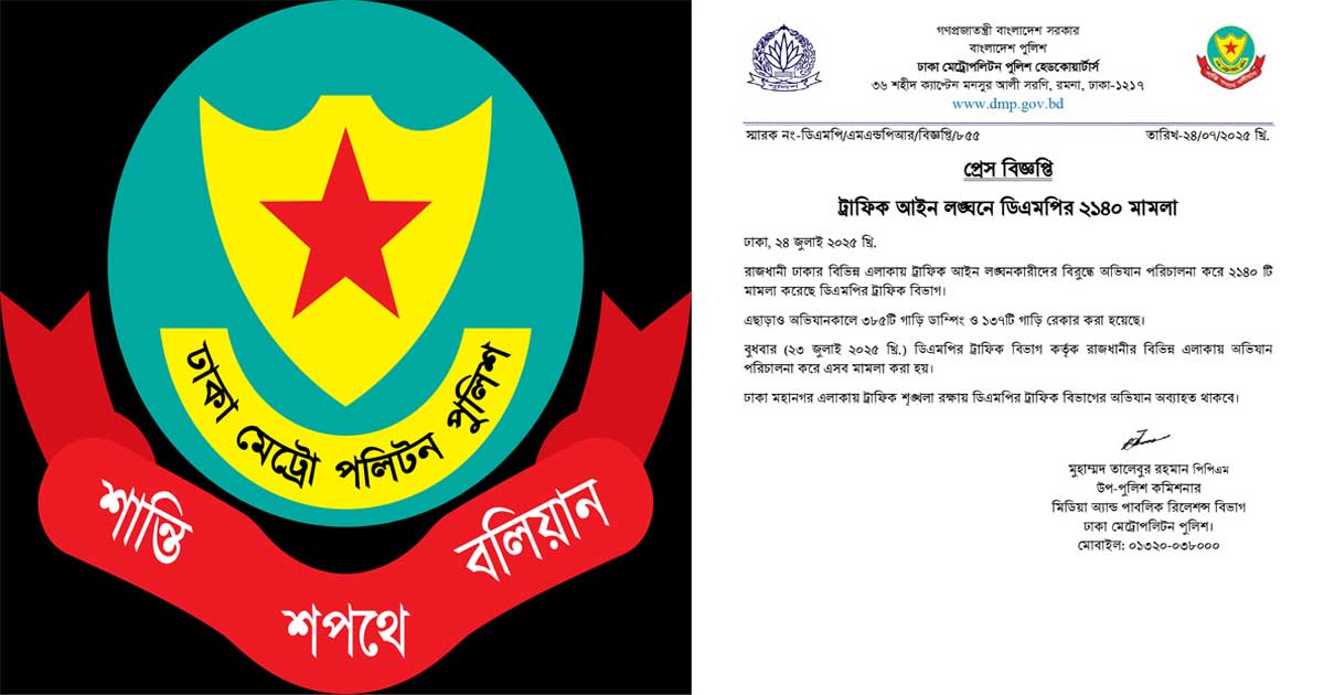 বুধবার (২৩ জুলাই ২০২৫ খ্রি.) ডিএমপির ট্রাফিক বিভাগ কর্তৃক রাজধানীর বিভিন্ন এলাকায় অভিযান পরিচালনা করে এসব মামলা করা হয়।