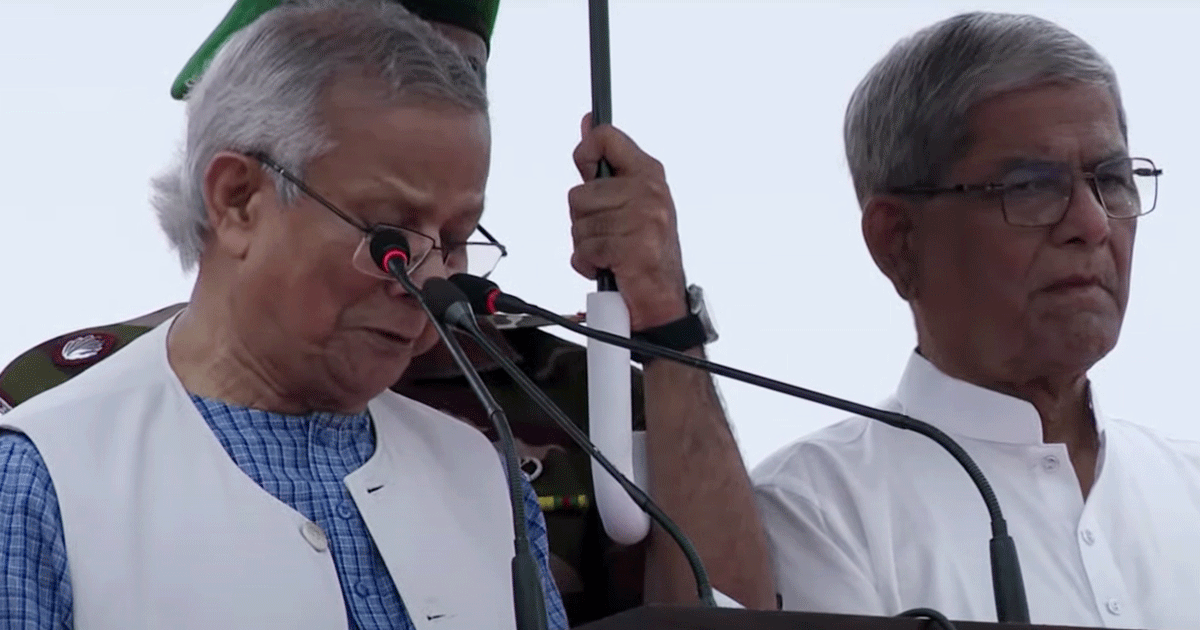 বৃষ্টির মধ্যেই বক্তব্য শুরু করে ইউনূস বলেন, ‘আল্লাহর রহমত হচ্ছে। সেই রহমত সঙ্গে নিয়েই আমি এই ঐতিহাসিক ঘোষণা পাঠ করছি।’তার এ বক্তব্যের সময় অনেকে করতালির মাধ্যমে সমর্থন জানান।