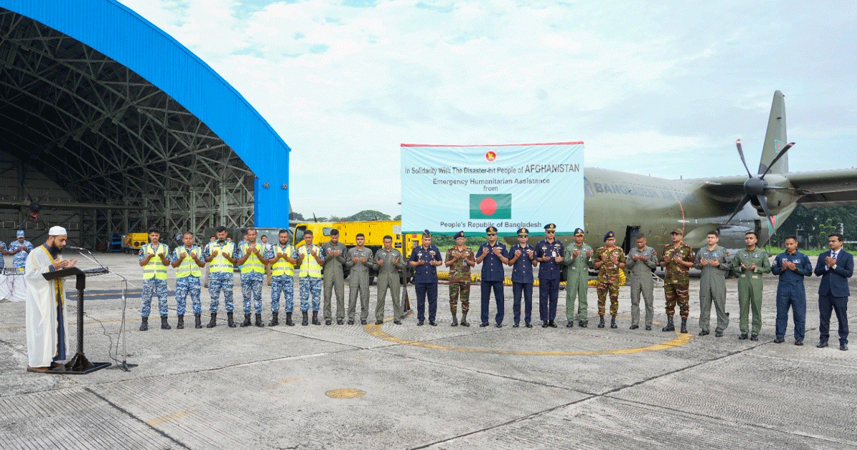 আইএসপিআর জানায়, শুক্রবার সকাল আটটায় বাংলাদেশ বিমান বাহিনীর একটি পরিবহন বিমান জরুরি ত্রাণ সামগ্রীসহ আফগানিস্তানের কাবুলের উদ্দেশ্যে রওনা করে। ১১ দশমিক ২২৭ টন ত্রাণ সহায়তার মধ্যে রয়েছে তাঁবু, কম্বল, শীতবস্ত্র, খাবার পানি, শুকনো খাবার, কাপড়, বিস্কুট, মিল্ক পাউডার, নুডুলস এবং ঔষধ। এসব ত্রাণ সামগ্রী হস্তান্তর শেষে বিমান বাহিনীর পরিবহন বিমানটি শুক্রবারই বাংলাদেশে প্রত্যাবর্তন করবে।