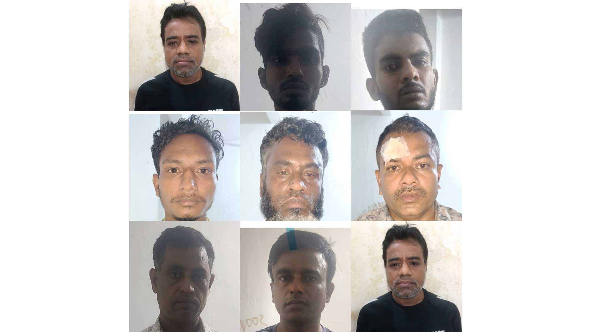গ্রেপ্তারকৃতরা হলো- ১। মোঃ কামাল হোসেন (৪৪) ২। মোঃ নুরে আলম (৪৫) ৩। মোঃ ওসমান (৩৯) ৪। মোঃ আব্দুর রহমান (৫৬) ৫। মোঃ বিল্লাল গড়ামী (৩০) ৬। মোঃ রনি (২৫) ৭। মোঃ শুভ ইসলাম কাউছার (২৪) ৮। বাপ্পী শিকদার (৩৫) ও ৯। মনিরুজ্জামান বাপ্পী ওরফে বাপ্পী শিকদার (৩২)।