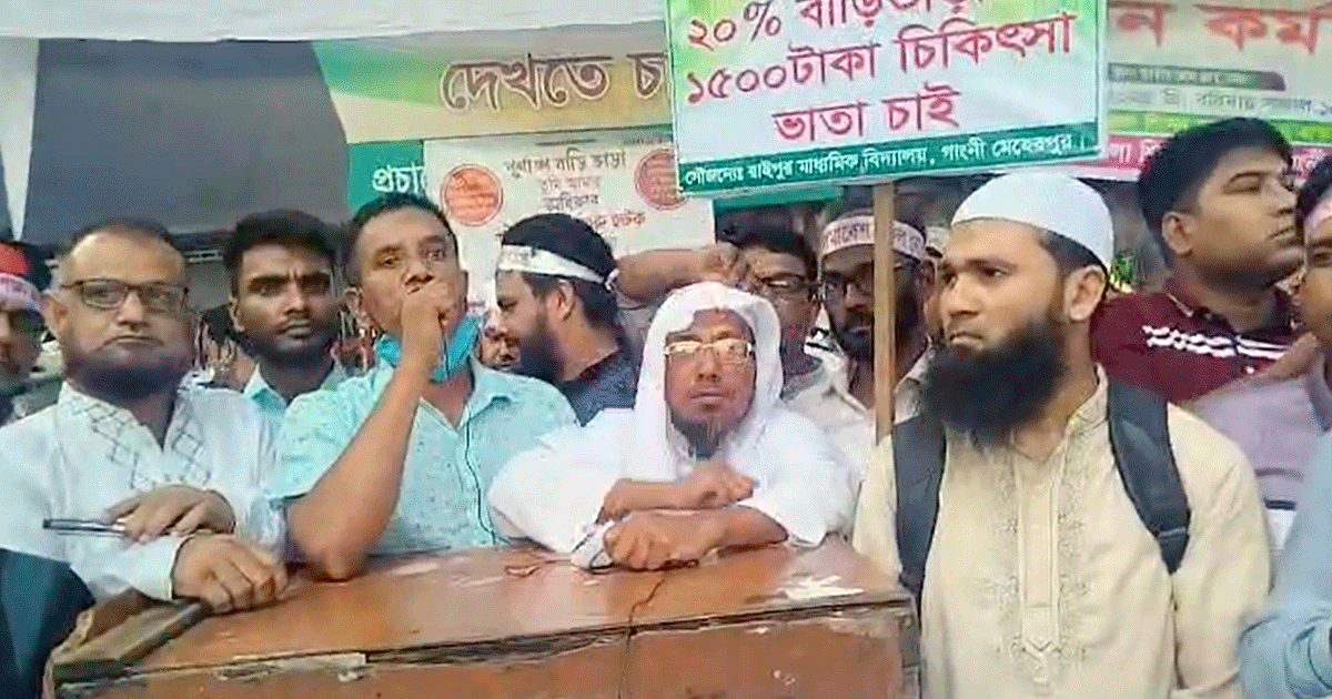 মূল বেতনের ২০ শতাংশ বাড়িভাড়া ও চিকিৎসা ভাতা বৃদ্ধির দাবিতে লাগাতার অবস্থান কর্মসূচি শুরু করেছেন বেসরকারি শিক্ষাপ্রতিষ্ঠানের এমপিওভুক্ত শিক্ষকরা।