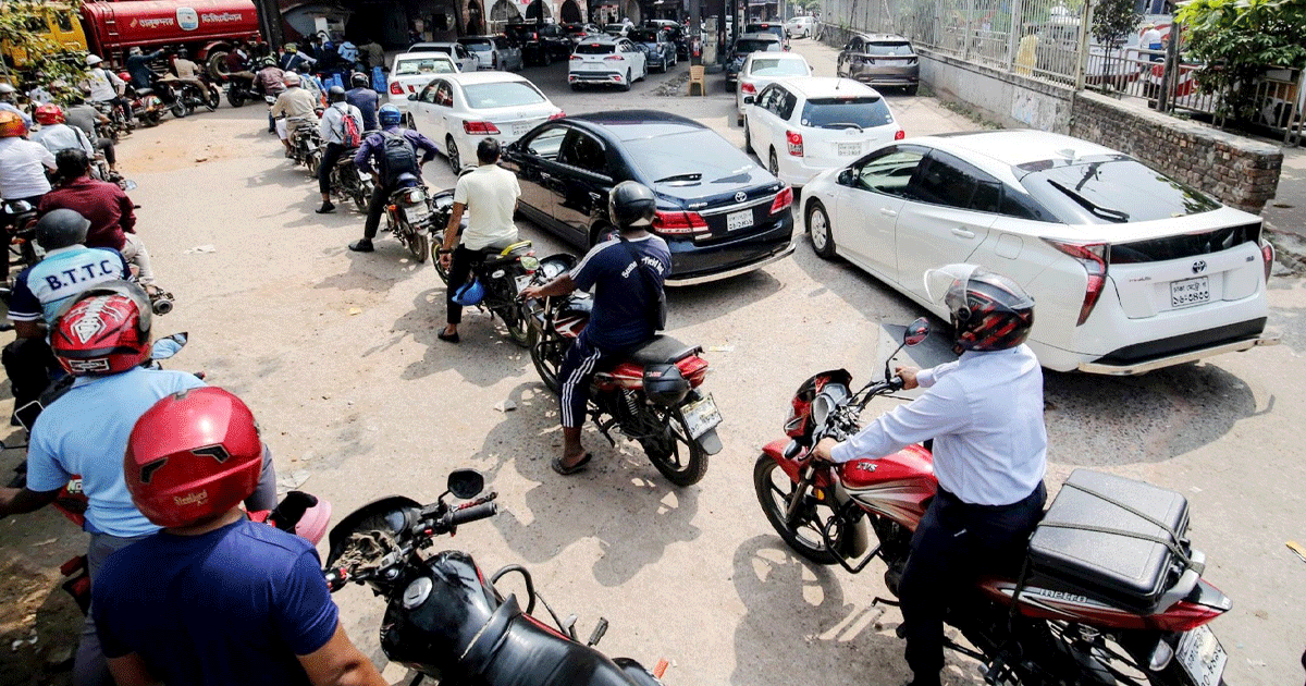 বুধবার সকালে তেল নিতে এসে দীর্ঘ সময় অপেক্ষা করতে হচ্ছে মোটরসাইকেল ও গাড়ি চালকদের।