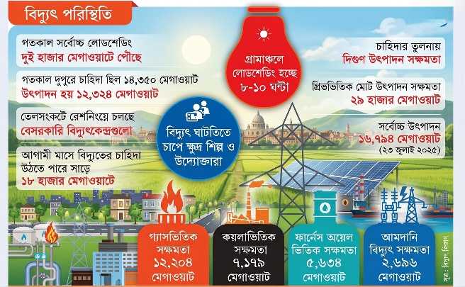 এদিকে মধ্যপ্রাচ্যের চলমান যুদ্ধ পরিস্থিতির প্রভাবে বৈশ্বিক জ্বালানি সরবরাহে অনিশ্চয়তা তৈরি হয়েছে। গ্যাস ও কয়লার সরবরাহ কমে যাওয়ায় দেশে প্রায় ২৯ হাজার মেগাওয়াট উৎপাদন সক্ষমতা থাকলেও তা পুরোপুরি কাজে লাগানো যাচ্ছে না। ব্যয়বহুল হওয়ায় তেলভিত্তিক বিদ্যুৎকেন্দ্রগুলোও সীমিত আকারে চালানো হচ্ছে।