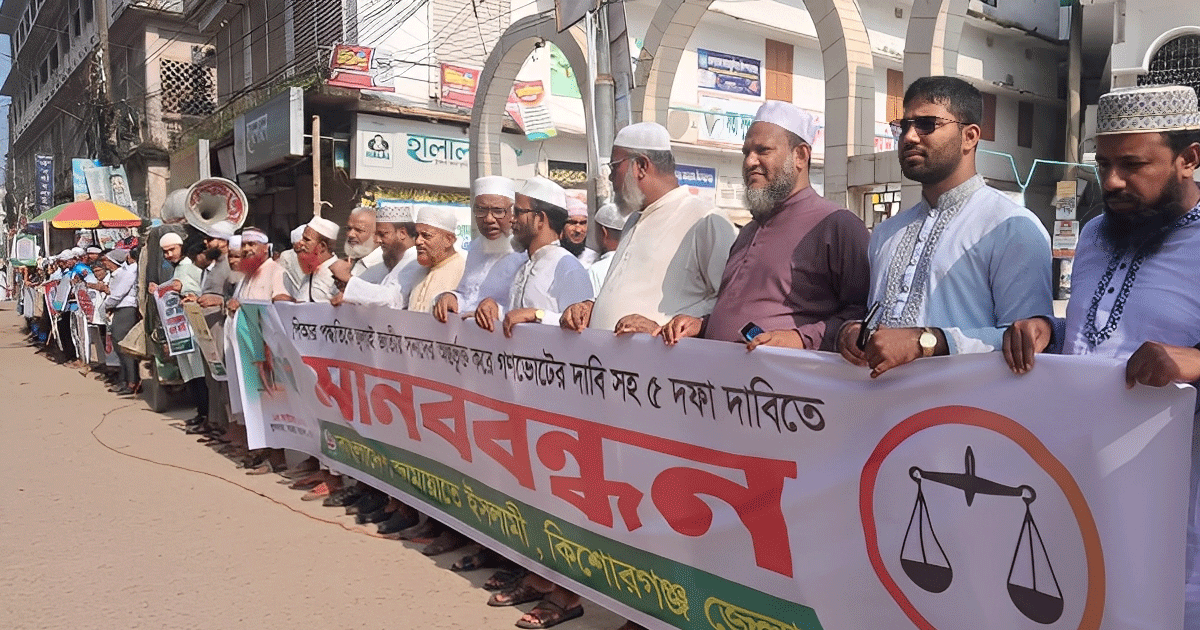 কেন্দ্রীয় কর্মসূচির অংশ হিসেবে জুলাই জাতীয় সনদের ভিত্তিতে আগামী ফেব্রুয়ারিতে জাতীয় নির্বাচনসহ পাঁচ দফা দাবি বাস্তবায়নের দাবিতে মানববন্ধন করেছে বাংলাদেশ জামায়াতে ইসলামী কিশোরগঞ্জ জেলা শাখা।