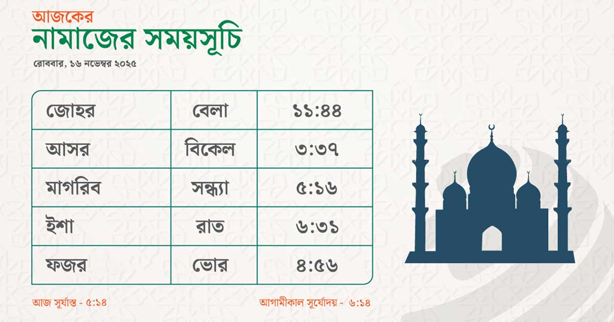 আজ রোববার ১৬ নভেম্বর, ২০২৫ (০১ অগ্রহায়ন, ১৪৩২ বাংলা, ২৪ জমাদিউল আউয়াল, ১৪৪৬ হিজরি) ঢাকা ও পার্শ্ববর্তী এলাকার নামাজের সময়সূচি তুলে ধরা হলো—