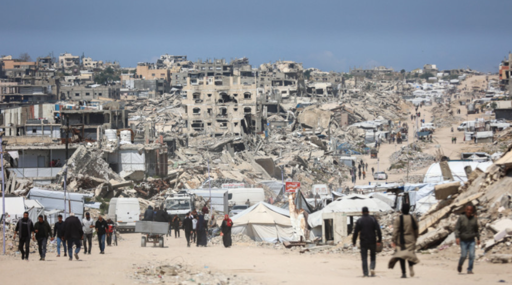 ১৩ এপ্রিল উত্তর গাজা উপত্যকার জাবালিয়া শরণার্থী শিবিরে ধ্বংসপ্রাপ্ত ভবনের ধ্বংসস্তূপের মধ্যে দিয়ে ফিলিস্তিনিরা হেঁটে যাচ্ছেন। ছবি: এএফপি